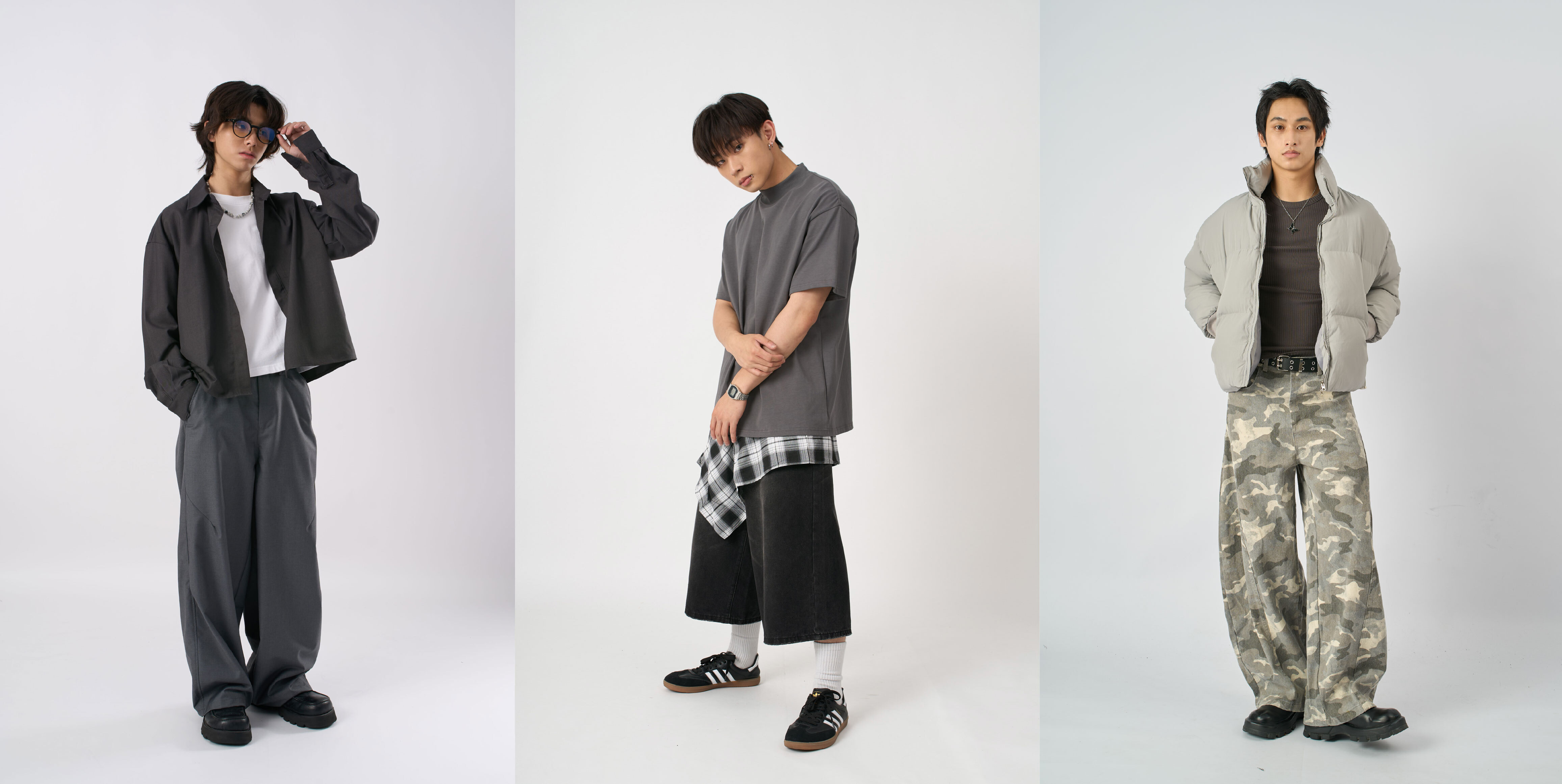 像是灰色格紋襯衫搭配韓國流行的黑白格紋屁簾配件、黑灰韓系條紋寬褲,不僅增加對比層次,也能讓整體造型更有街頭氛圍。