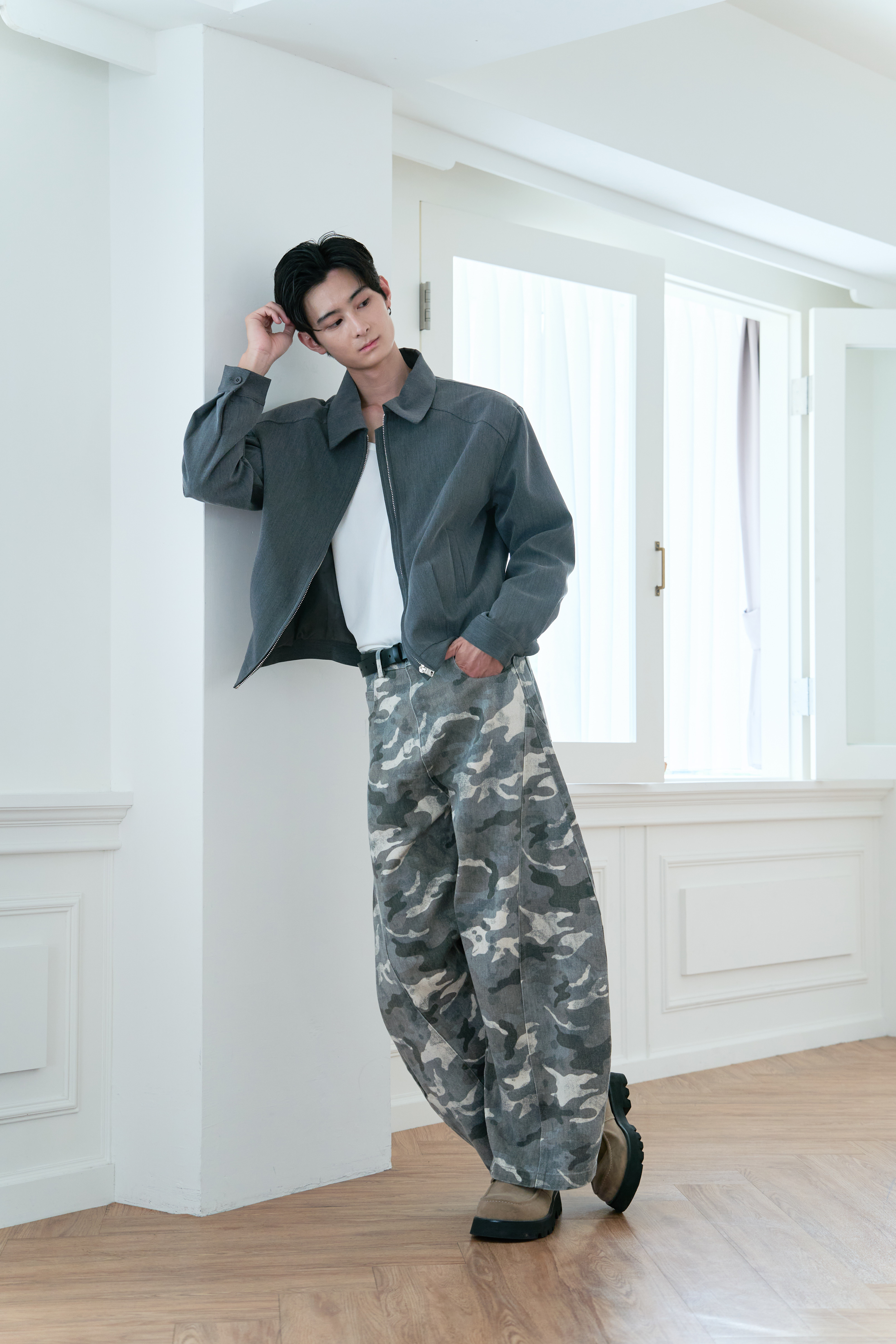👉商品參考:解構弧面切線迷彩彎刀褲、俐落剪裁短版西裝外套
