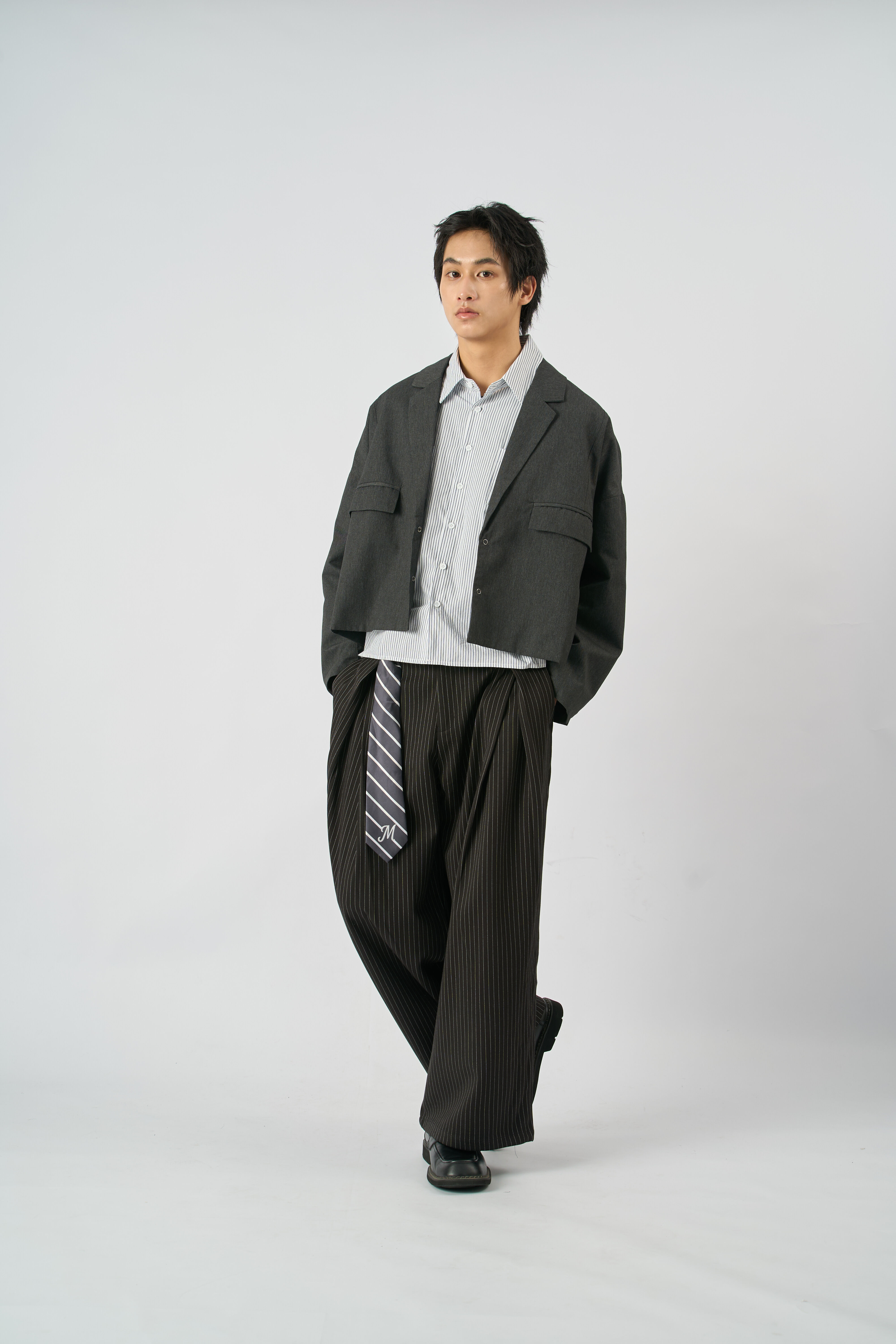進階穿搭的另一個關鍵是「紋理與材質」,要穿出這樣的穿搭方向,灰色條紋牛仔褲,或是帶點透明感的黑灰襯衫做外搭,就能瞬間增加造型層次。