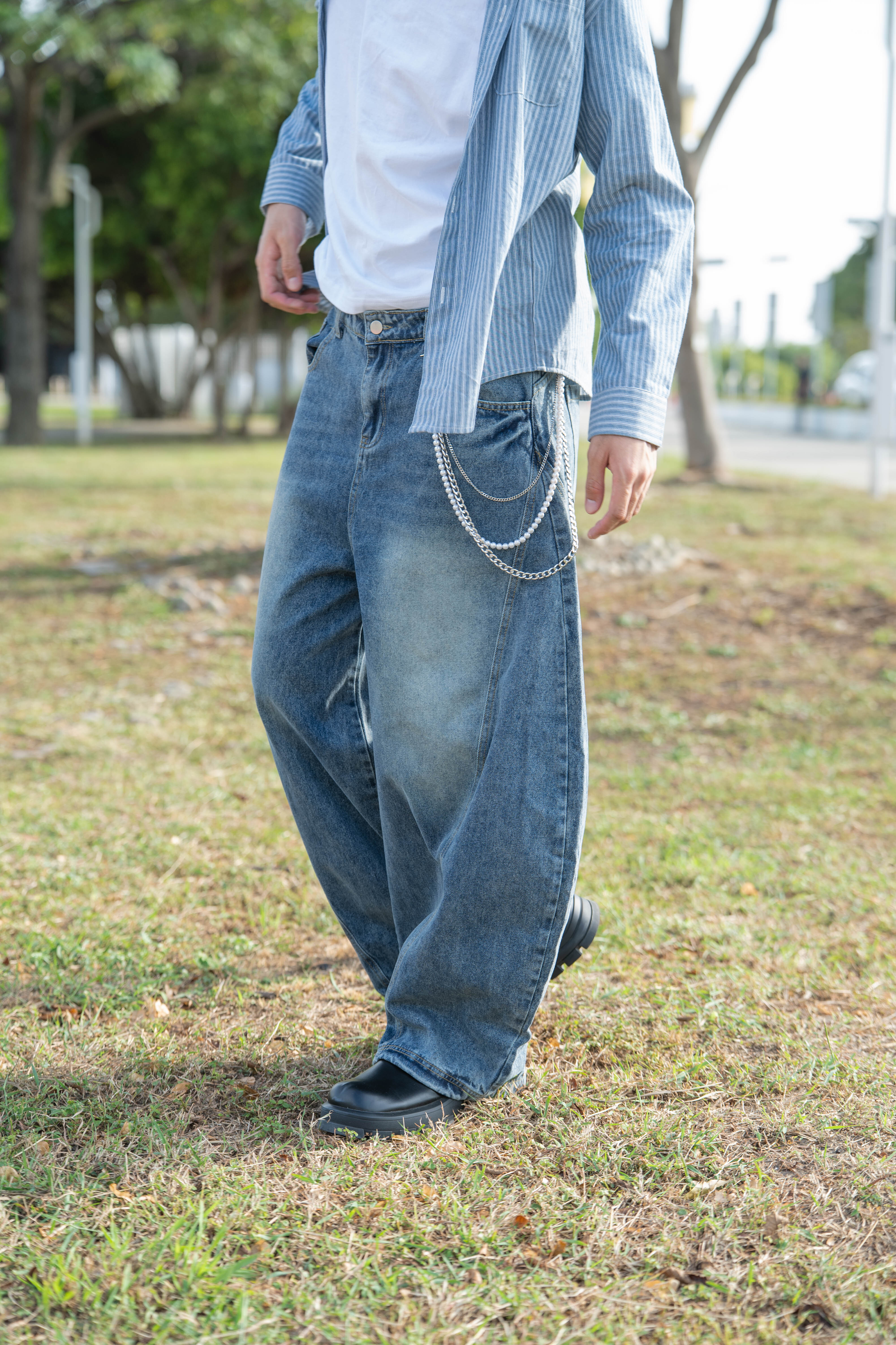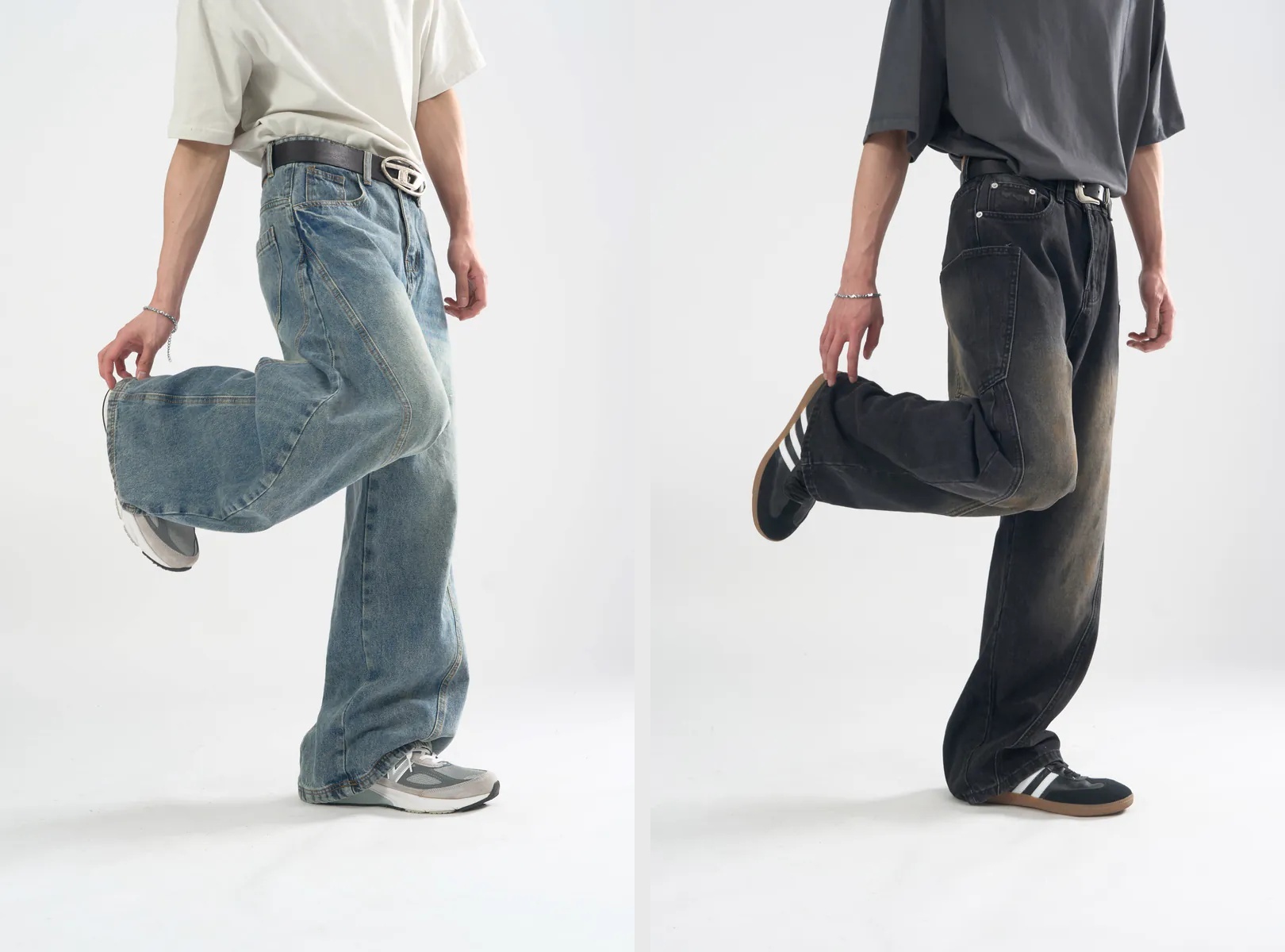 最近韓團舞台、造型師都愛用帶刷色、抽鬚、拼布或破損細節的設計——這些元素能瞬間把褲子從「基本款」升級成「造型主角」,無論搭配素T、襯衫或短版外套,都能輕鬆穿出韓系街頭的率性感。