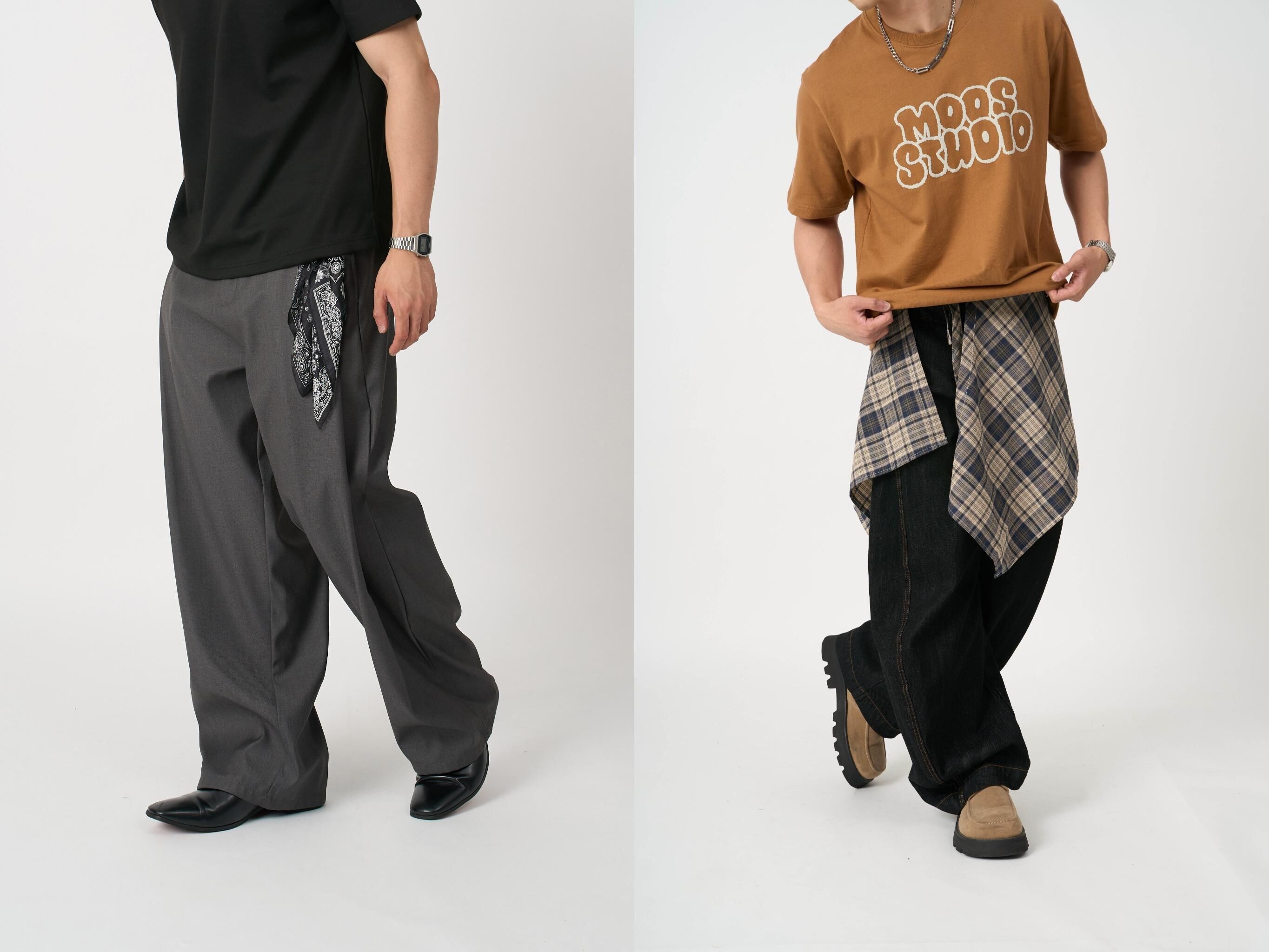 另外,布料挺度也是關鍵,像西裝料、厚磅丹寧、或挺版混紡布料,都能在保持落地效果的同時維持俐落感,避免出現「軟趴趴」的垮褲線條。