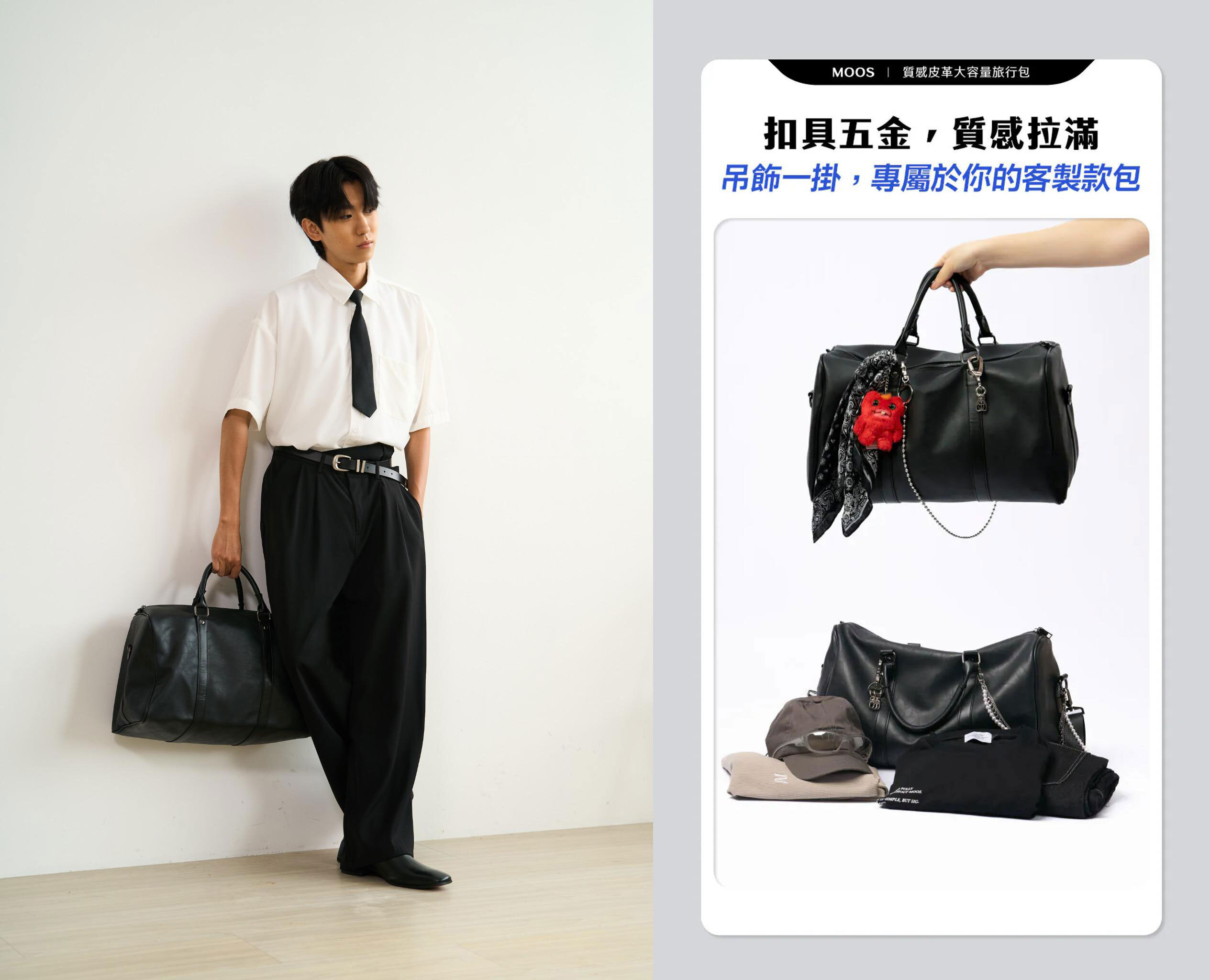 以硬挺的手提袋或旅行袋來說,配上落地西裝褲的穿搭,在風格上就顯得更有質感,當然如果你想拿這類型的包包走街頭穿搭的風格,你也可以掛上近期很火的方巾、鑰匙圈做裝飾,玩出更多不同的穿搭。