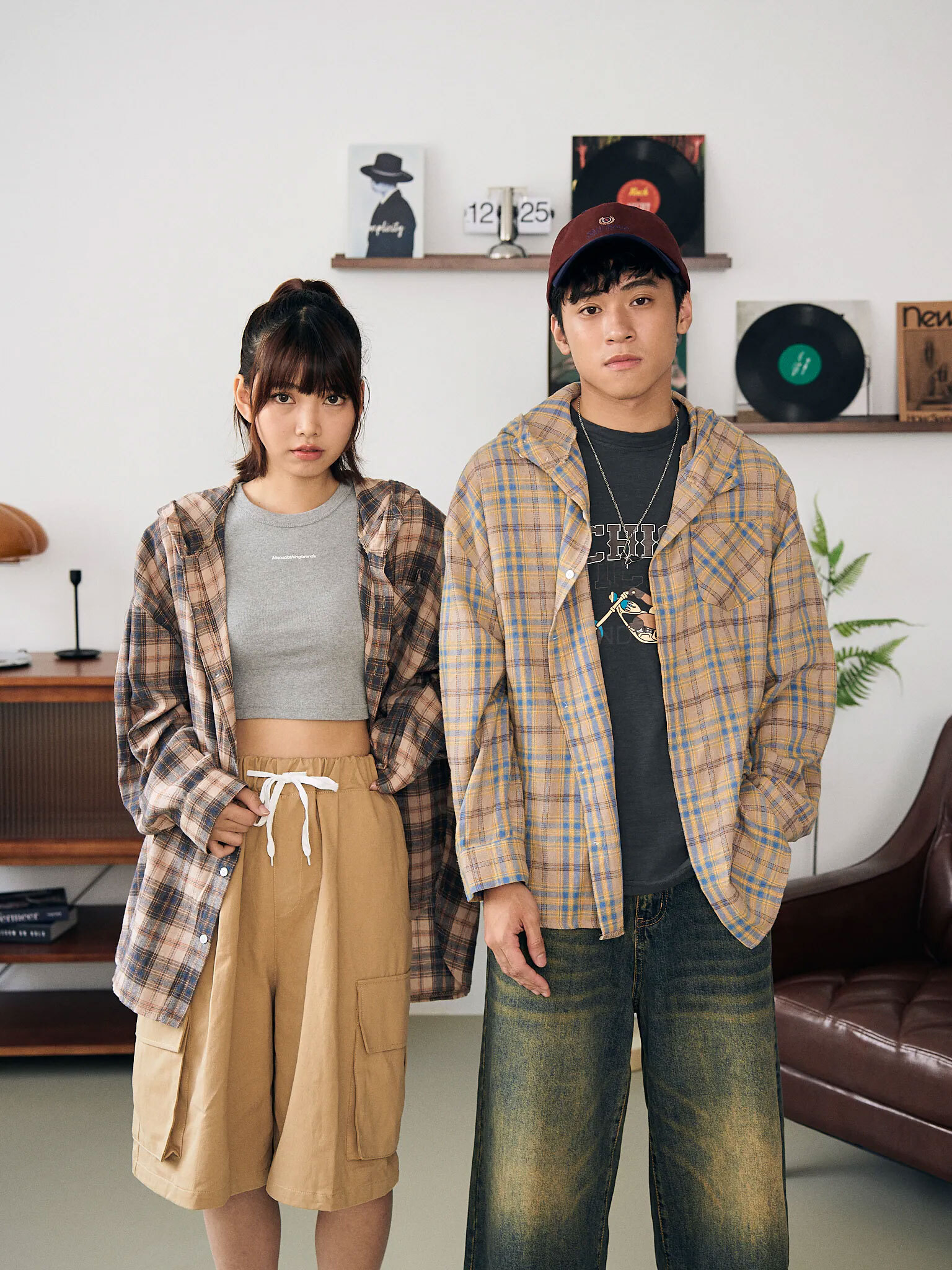 👉商品參考:格子連帽長袖襯衫、復古寬鬆刷色七分牛仔褲、大口袋抽繩工裝短褲