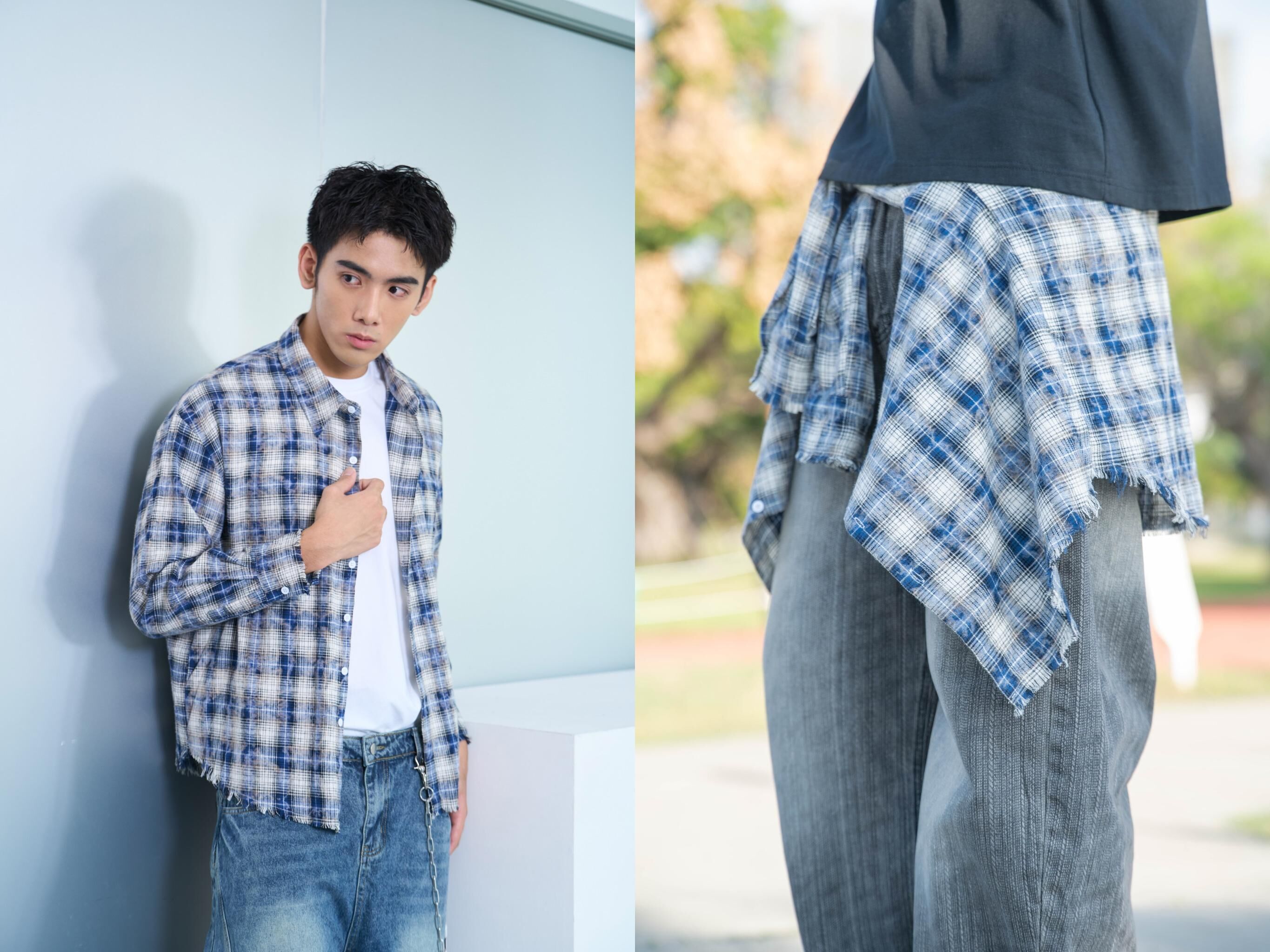 要把中性風跟韓系服裝結合,不用想太多,抓一件格紋襯衫就對了。中大格間距、高對比刷色、毛邊抽鬚與微做舊是街頭質感關鍵。