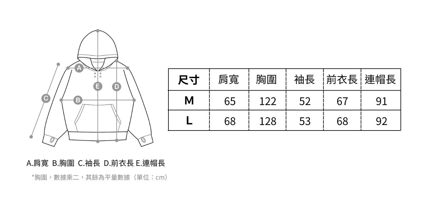 L 肩寬68 / 胸圍128 / 袖長53 / 衣長68(含帽92)