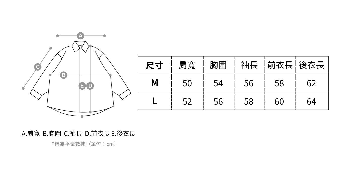 L 肩寬52 / 胸圍56 / 袖長58 / 前衣長60 / 後衣長64