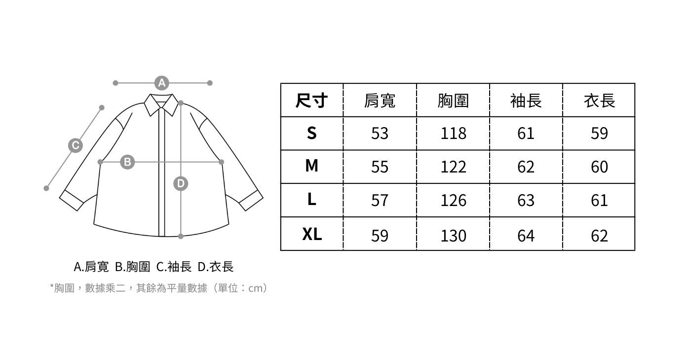 L 肩寬57 / 胸圍126 / 袖長63 / 衣長61