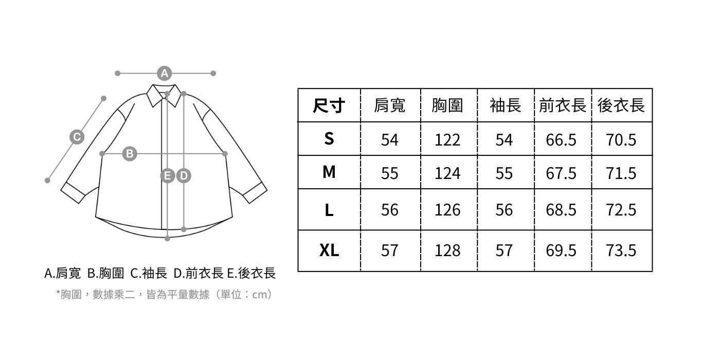 XL 肩寬57 / 胸圍128 / 袖長57 / 前衣長69.5 後衣長73.5