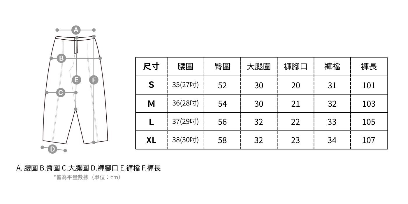 L 腰圍37(29吋)/ 臀圍56 / 大腿圍32 / 褲腳口22 / 褲襠33 / 褲長105
