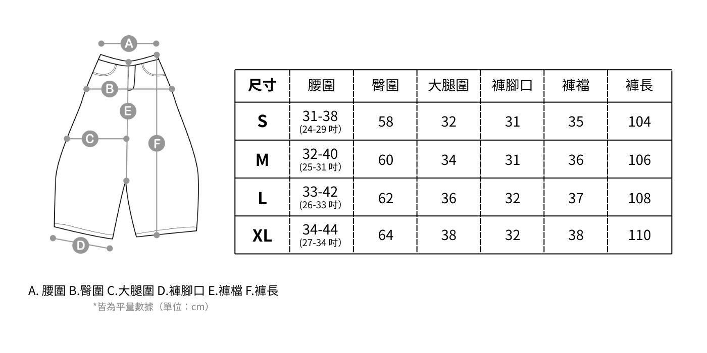 XL 腰圍34-44(27-34吋)/ 臀圍64 / 大腿圍38 / 褲腳口32 / 褲襠38 / 褲長110