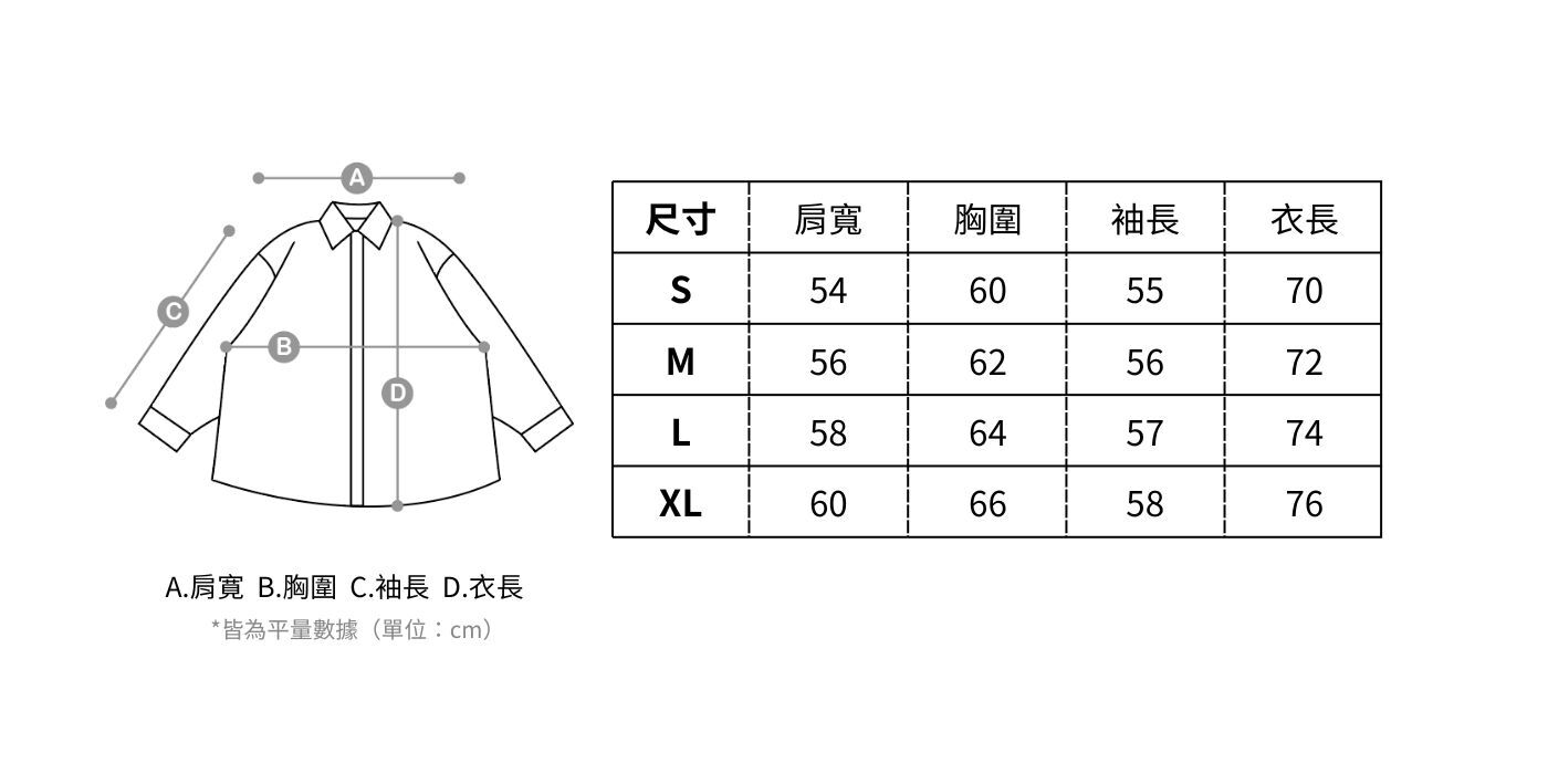 S 肩寬54 / 胸圍60 / 袖長55 / 衣長70