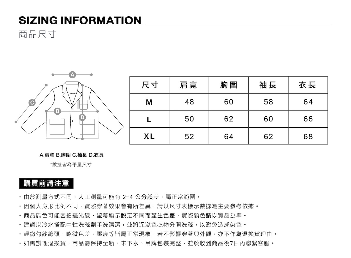 M 肩寬48 / 胸圍60 / 袖長58 / 衣長64