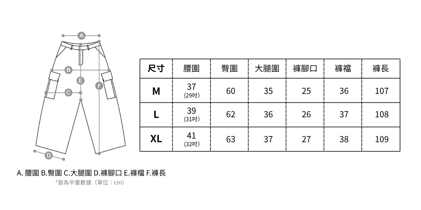 M 腰圍37(29吋)/ 臀圍60 / 大腿圍35 / 褲腳口25 / 褲襠36 / 褲長107
