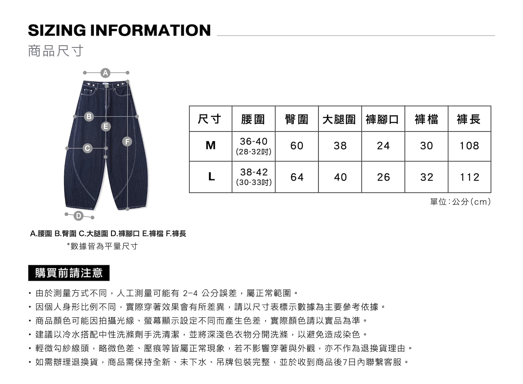 M 腰圍36-40(28-32吋)/ 臀圍60 / 大腿圍38 / 褲襠30 / 褲腳口24 / 褲長108
