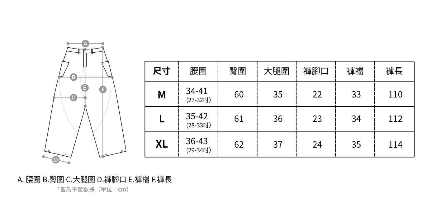 M 腰圍34-41(27-32吋)/ 臀圍60 / 大腿圍35 / 褲腳口22 / 褲襠33 / 褲長110