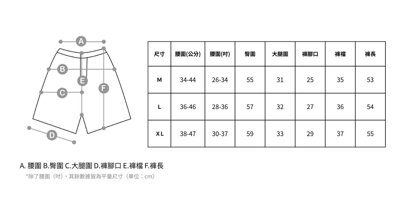 M 腰圍(公分) 34-44 / 腰圍(吋) 26-34/臀圍 55 / 大腿圍 31/ 褲腳口25 / 褲襠 35 / 褲長53