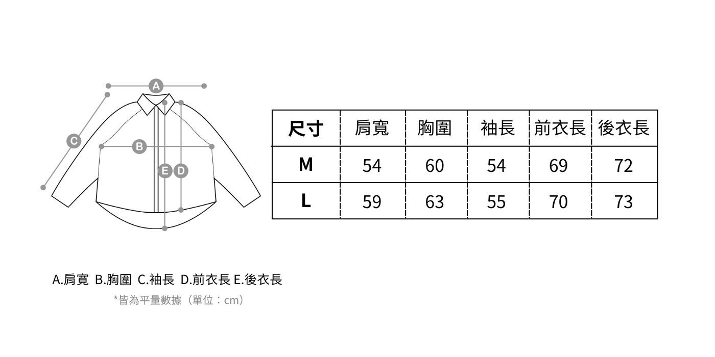 M 肩寬54 / 胸圍60 / 袖長54 / 前衣長69 / 後衣長72