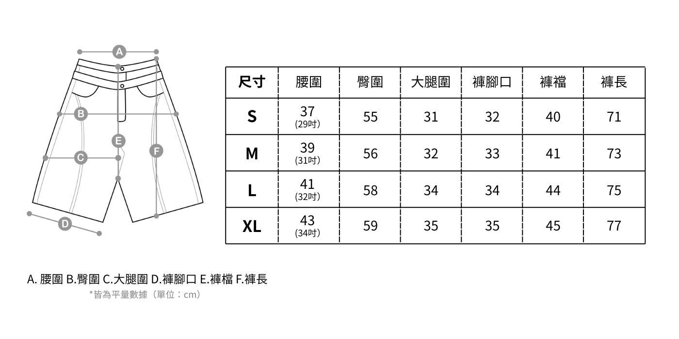 XL 腰圍43(34吋)/ 臀圍59 / 大腿圍35 / 褲腳口35 / 褲襠45 / 褲長77